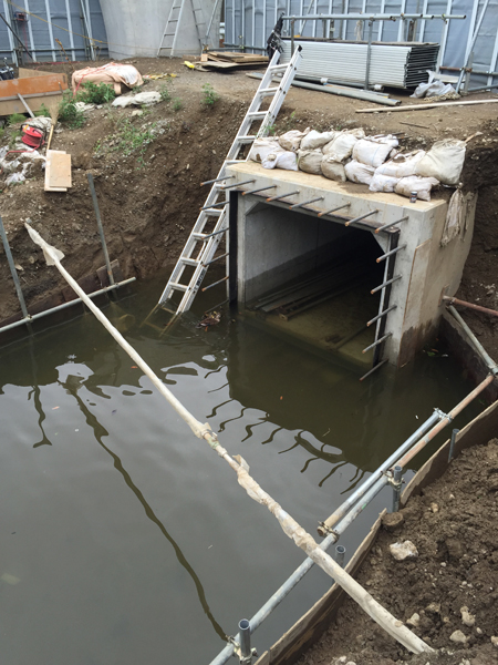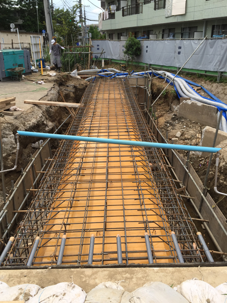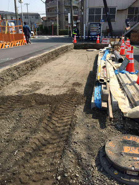 既存幹線道路をまたぐように高架道路を設置する為の橋脚を建築しました、また建築時に建築予定地の地中に暗渠(あんきょ)があるため、暗渠の移設工事も同時に行いました。