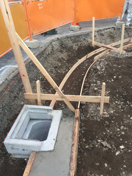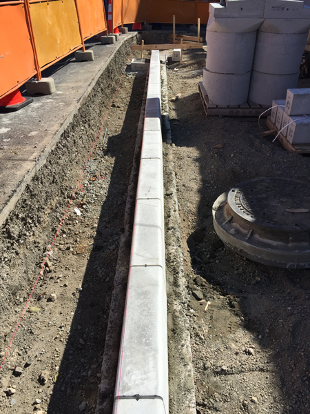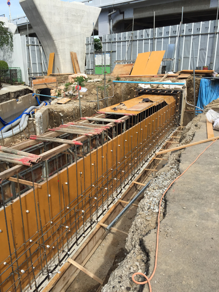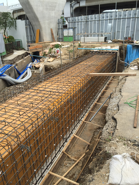 既存幹線道路をまたぐように高架道路を設置する為の橋脚を建築しました、また建築時に建築予定地の地中に暗渠(あんきょ)があるため、暗渠の移設工事も同時に行いました。